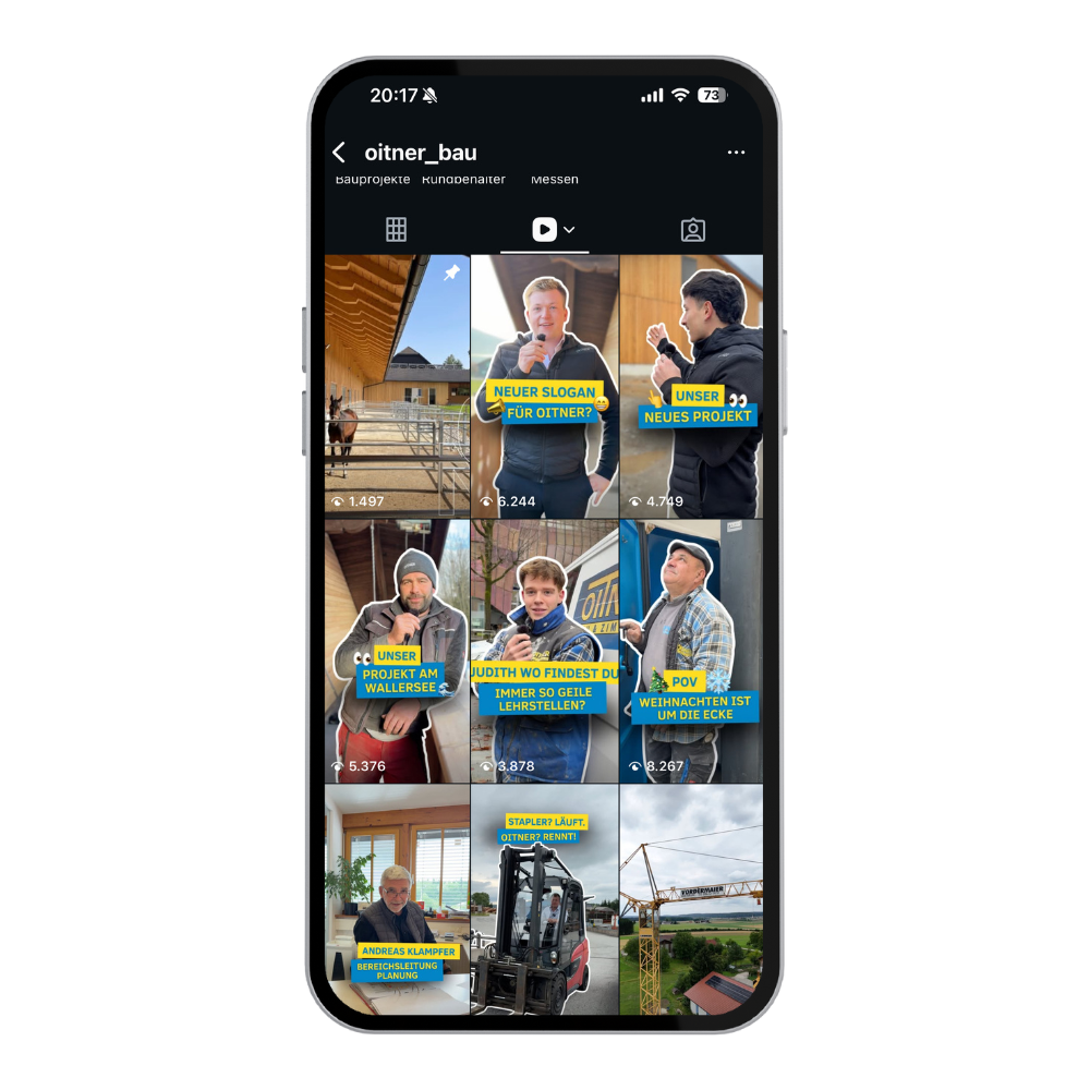 Für Oitner Bau übernahmen wir die laufende Social-Media-Betreuung mit Fokus auf Reels und Video-Content. Durch authentische Einblicke in Projekte, Baustellen und das Team wurde die Sichtbarkeit gesteigert und die Marke nachhaltig in der Baubranche positioniert.